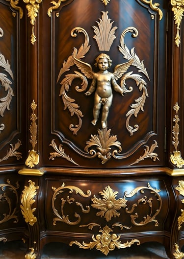 Gimęs XVII a. Italijoje. Barokas buvo galios ir religijos šventė – masyvūs, simetriški baldai su raižytais cherubinais (cherub) ir augalų motyvais. Liudviko XIV Versalio rūmuose André-Charles Boulle kūrė įspūdingus baldus su vėžlio kiauto inkrustacijomis, spindinčiais karališkąja didybe. Barokas, kaip ir Rokoko, mėgo vingius ir auksą, tačiau jo simetrija ir sunkumas reikalavo pagarbaus žvilgsnio, o Rokoko kvietė šypseną. Regento laikotarpio baldai, tokie kaip Cressent komodos, sujungė abu stilius, išlaikydami Baroko prabangą, bet pridėdami Rokoko lengvumo.