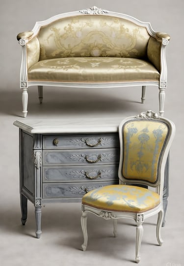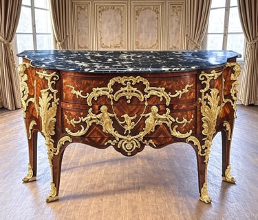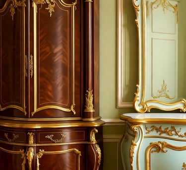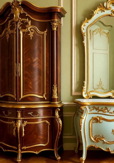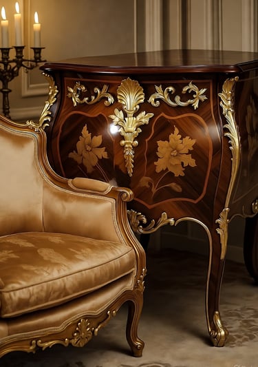 Rokoko baldai yra tarsi teatro spektaklis – asimetrija ir gamtos įkvėpti motyvai paverčia juos gyvais. Skirtingai nuo baroko simetrijos, rokoko baldai žavi S ir C formos vingiais, primenančiais vijoklius ar bangas. Kėdės ir sofos turėjo lenktas kojas, vadinamas cabriole, kurios atrodė tarsi gyvūnų galūnės, o apmušalai iš šilko ar aksomo suteikė švelnumo. Medžiagos buvo kruopščiai parinktos: vaismedžiai, tokie kaip riešutmedis ar vyšnia, suteikė šiltų tonų, o egzotiška markizacija ar lakuotos plokštės, įkvėptos chinoiserie (kinų motyvų), pridėjo prabangos. Auksiniai bronzos ornamentai – lapų, kriauklių ar mitinių būtybių formos – spindėjo tarsi auksas, o bombé formos (išsipūtę, apvalūs) komodos pabrėžė stiliaus sklandumą.