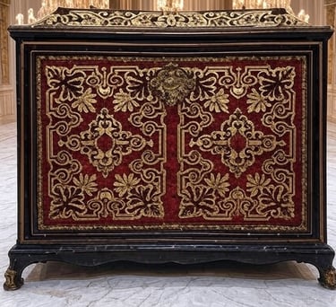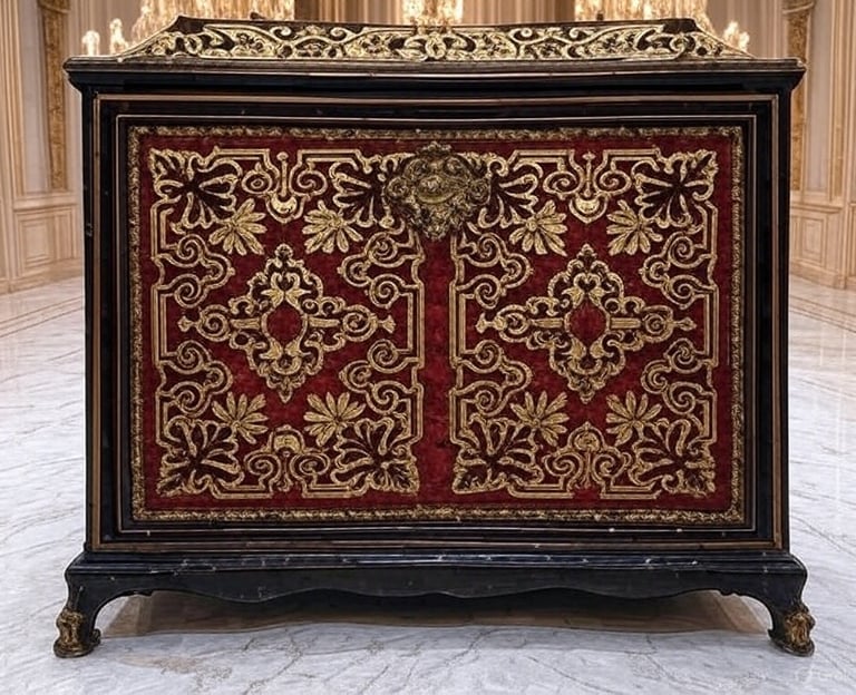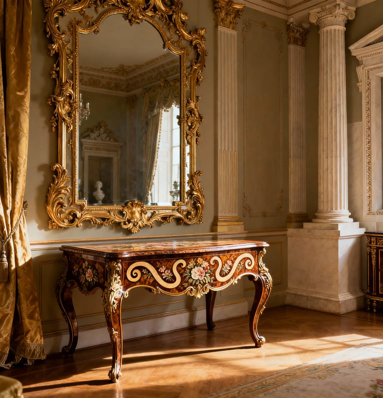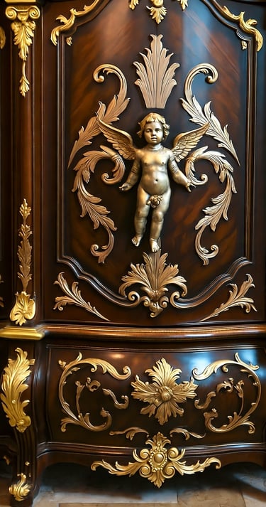 Gimęs XVII a. Italijoje. Barokas buvo galios ir religijos šventė – masyvūs, simetriški baldai su raižytais cherubinais (cherub) ir augalų motyvais. Liudviko XIV Versalio rūmuose André-Charles Boulle kūrė įspūdingus baldus su vėžlio kiauto inkrustacijomis, spindinčiais karališkąja didybe. Barokas, kaip ir Rokoko, mėgo vingius ir auksą, tačiau jo simetrija ir sunkumas reikalavo pagarbaus žvilgsnio, o Rokoko kvietė šypseną. Regento laikotarpio baldai, tokie kaip Cressent komodos, sujungė abu stilius, išlaikydami Baroko prabangą, bet pridėdami Rokoko lengvumo.